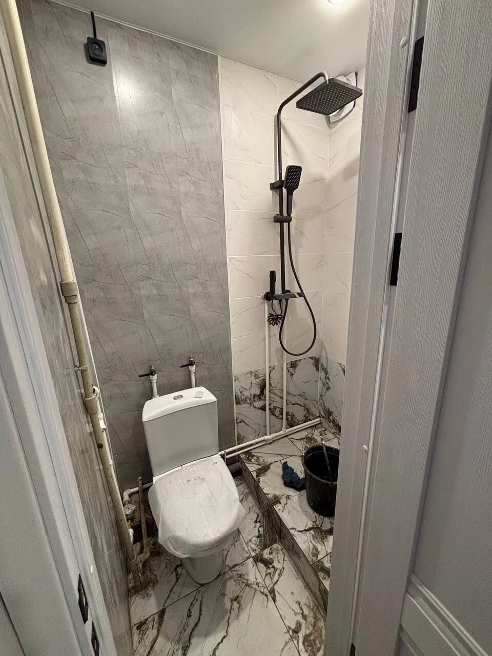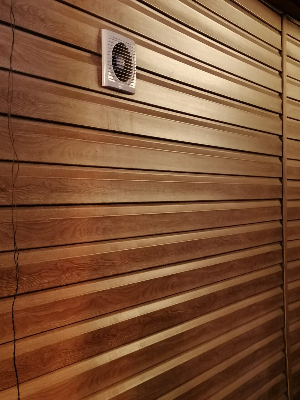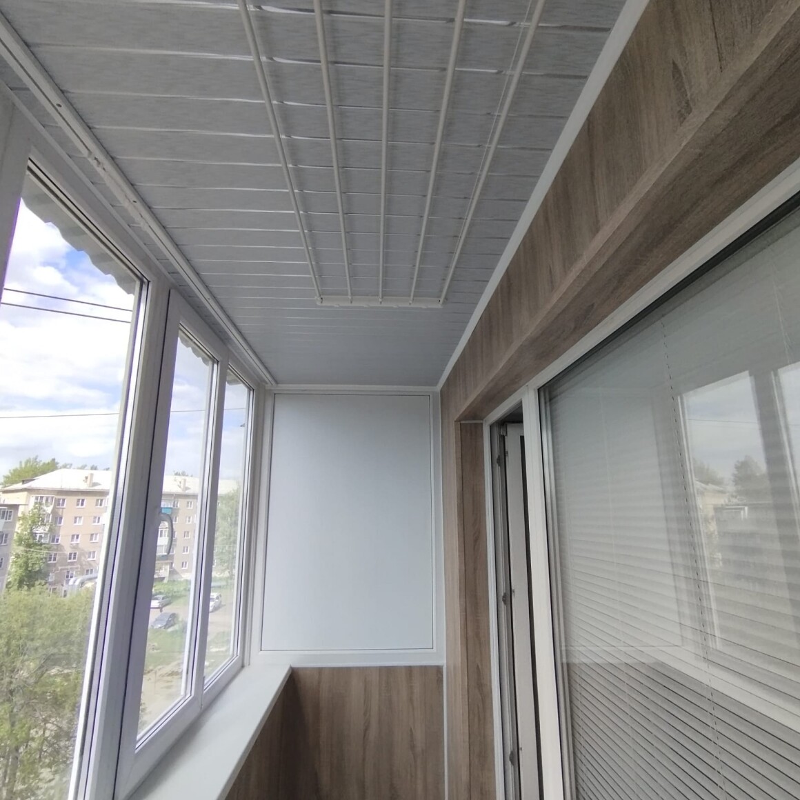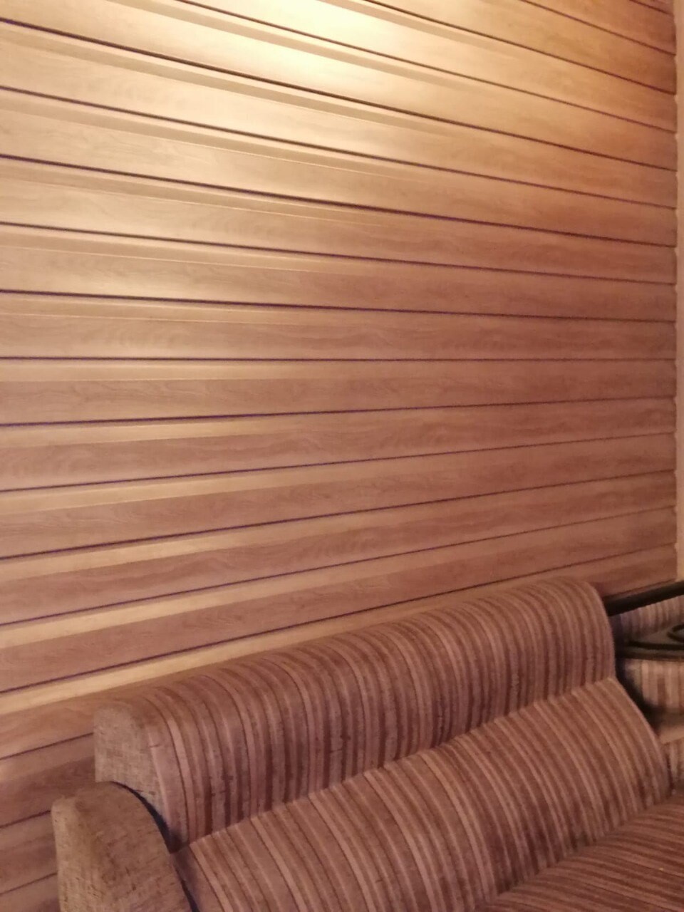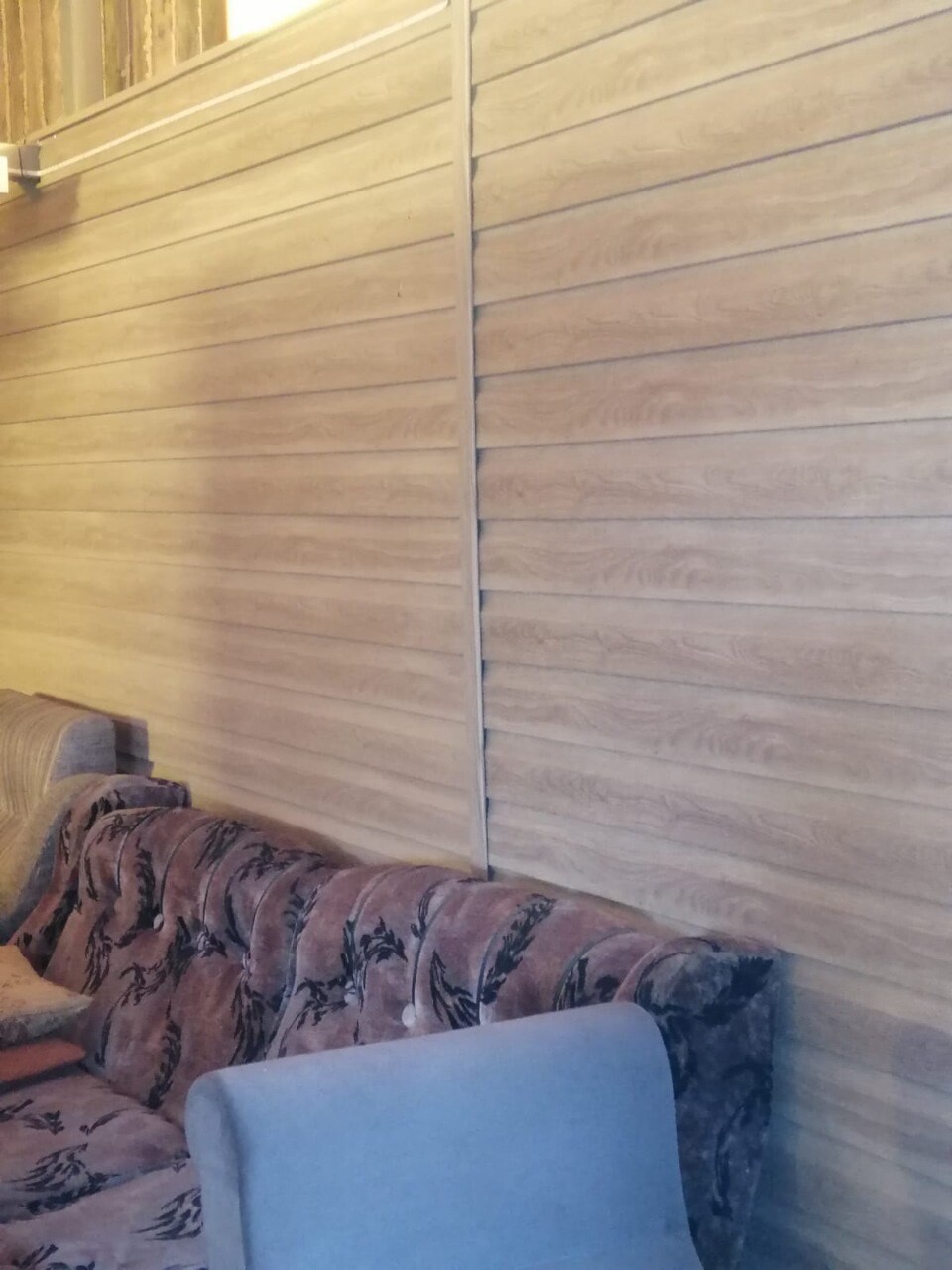 На потолок использовали панели ПВХ серый штрих с глиттером.